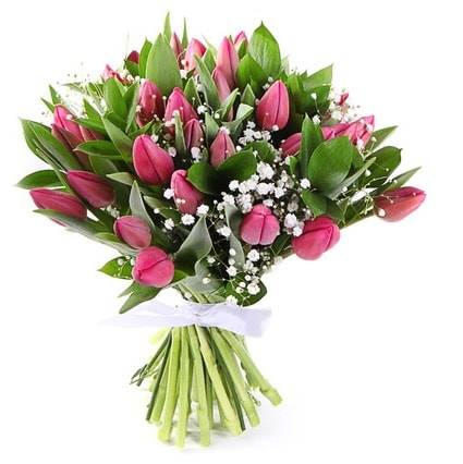 Букет из тюльпанов темно-розового цвета очарует девушку и обрадует близкого друга. Розовые тюльпаны на языке цветов означают молодость, нежность и грацию. Гипосфила и другая зелень придают букету изысканный внешний вид, обеспечивая прочную связь с природой, к которой так и тянется душа. «Изыск» - отличный букет для подарка возлюбленной или друзьям.