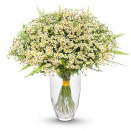 Букет состоит из полевых ромашек, универсальных красивых цветов, которые можно подарить как любимой девушке, так и коллеге. Белый цвет лепестков символизирует искренность и чистоту намерений. «Полевой» букет из ромашек – приятный жест для небезразличных вам людей. Запах поля окутает, унося к природе, в мир душевного равновесия и отличного настроения.