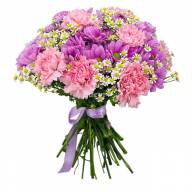 Яркий букет станет превосходным подарком в честь дня рождения любимой подружки. Розово-фиолетовые оттенки цветочной композиции подчеркнут всю юность и прелесть получательницы. Милые гвоздики, кустовые хризантемы и нежные ромашки создают поистине утонченный и весенний комплект. Декорированный атласной лентой букет поможет попросить прощения у дорогого человека.