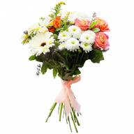 Великолепная цветочная композиция «Встреченная в поле» излучает собой сладкий, манящий аромат и невероятное тепло долгожданного лета. Собранные воедино с помощью розовой ленточки нежные хризантемы, ароматные розы, крупные герберы и декоративная зелень смотрятся достаточно привлекательно и оригинально.